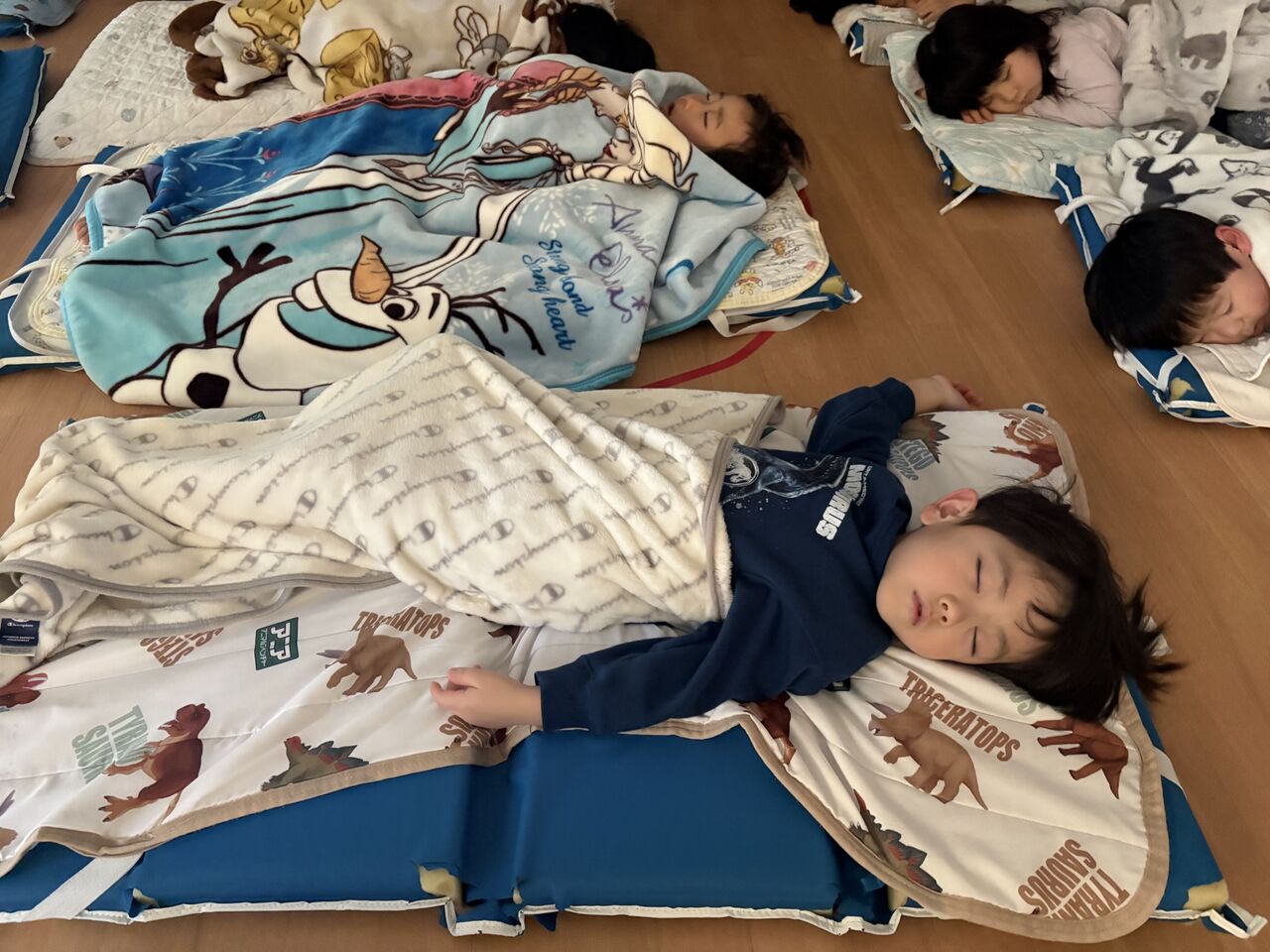 きりん組(4歳児クラス)幼児クラスとなると保育者が見守る中、自分から布団に入って体を休め
